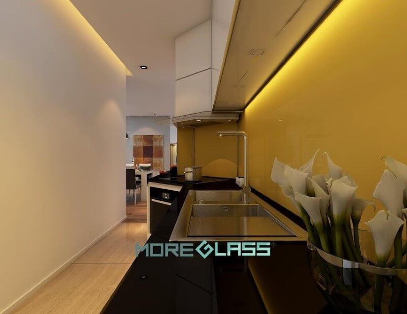 Sắp xếp mẫu kính ốp bếp màu vàng thư tươi tắn cho không gian phòng bếp thêm mới lạ đầy sức sống.