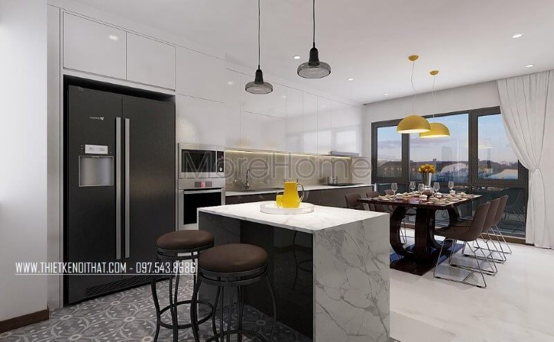 Thiết kế phòng ăn lồng phòng bếp hiện đại tạo nên không gian vừa đẹp vừa tiện nghi vừa sang trọng.