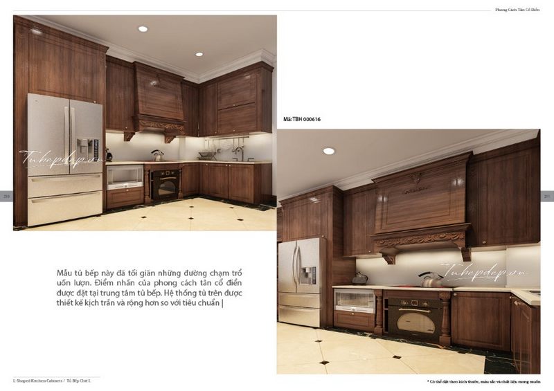 Hệ thống tủ bếp gỗ óc chó cao cấp với thiết kế tân cổ điển, có tủ bếp trên kịch trần và các ngăn để được thiết kế rộng hơn để tránh sự rườm rà không cần thiết