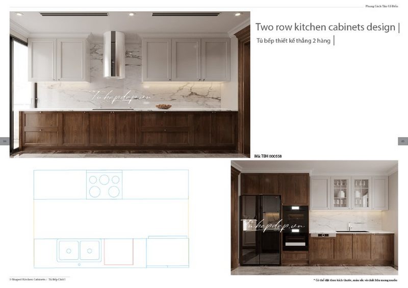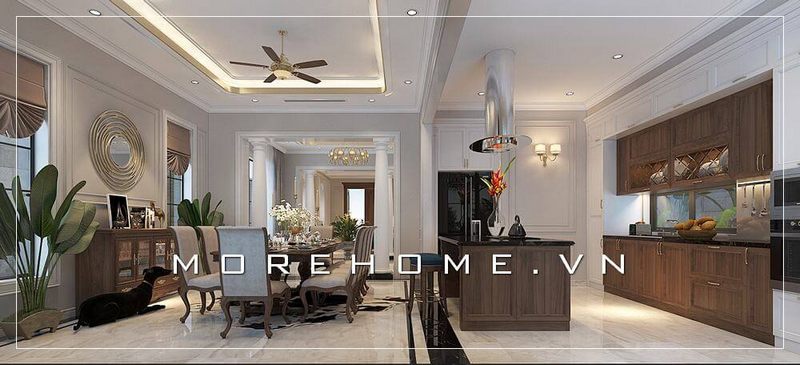 MoreHome đề nghị sử dụng mẫu tủ bếp tân cổ điển có kiểu dáng gọn gàng để tạo nên không gian bếp tiện nghi và sang trọng.